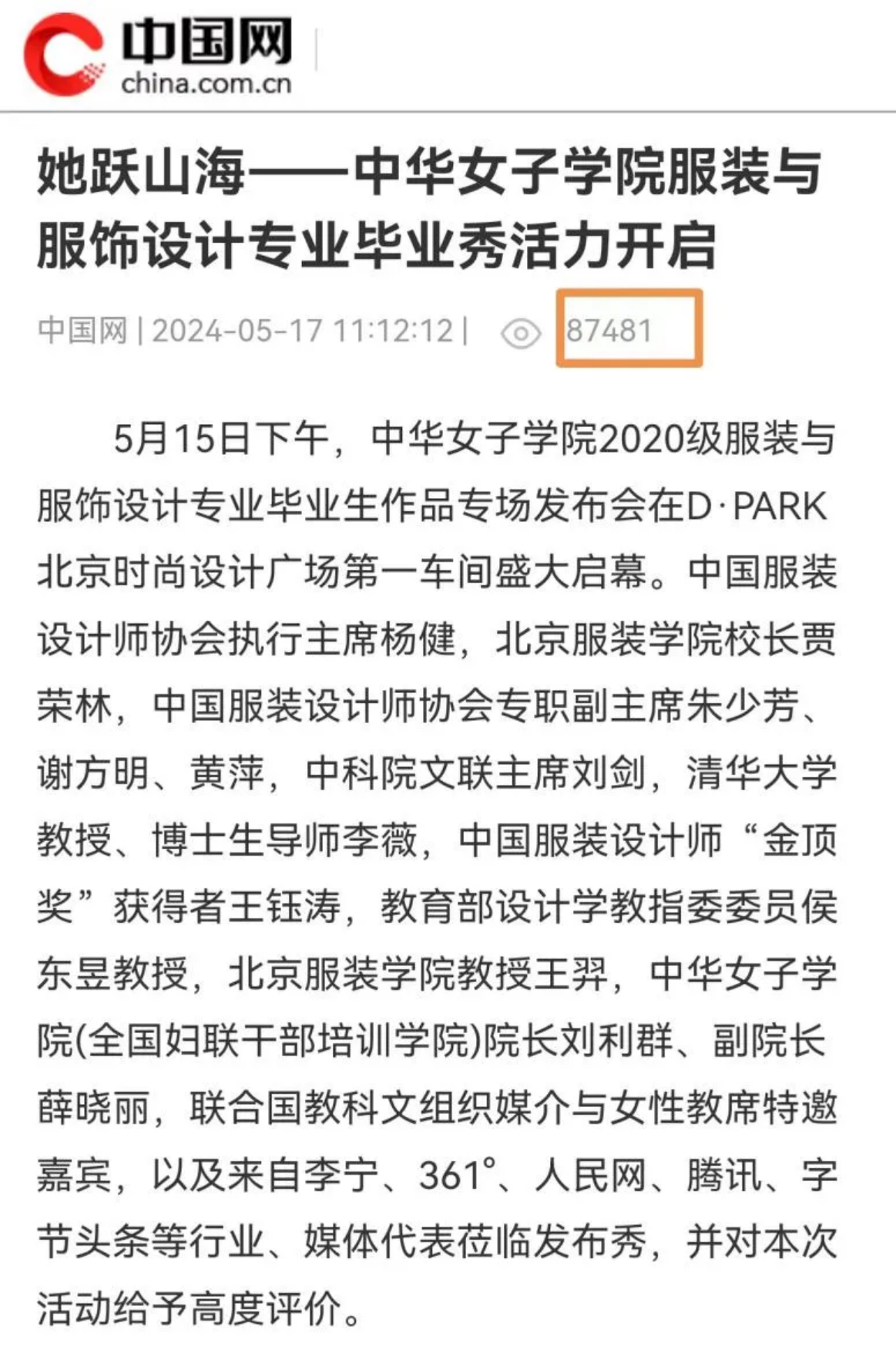 5月15日下午,中华女子学院2020级服装与服饰设计专业毕业生作品专场发布会在京成功举办。人民日报、中国网、腾讯、新浪、全球纺织网、澎湃新闻等多家主流及知名媒体平台进行相关报道,浏览点击率突破二十万,毕业优秀作品在中国妇女、中国大学生时装周、中华女子学院微信视频号同步展示。